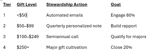 Months 7-9: Create the Upgrade Pathway - Segment and cultivate high-value monthly donors. Success metric: Move 5+ monthly donors into major gift portfolio.