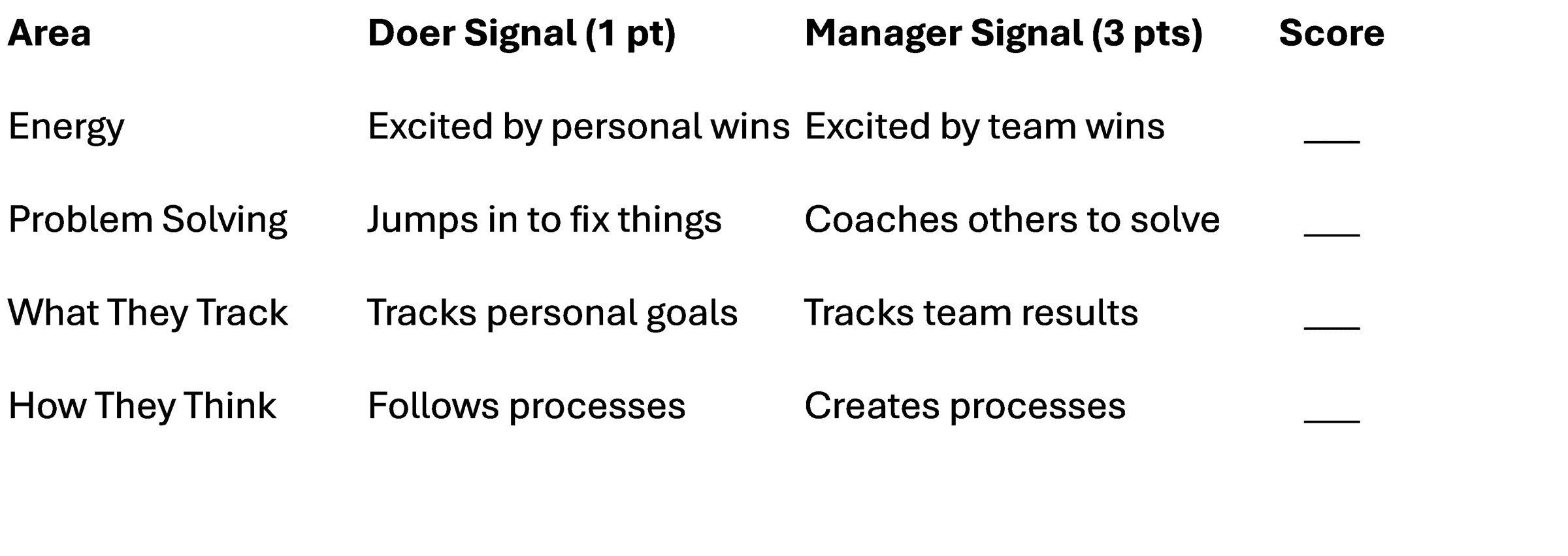 The fix is a simple system I now use before every director-level promotion: The Doer vs. Manager Matrix.